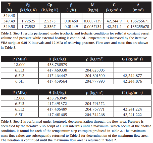 Tables 2 and 3 provide representative outputs of the calculation method for the relieving pressure of 12 MPa.
