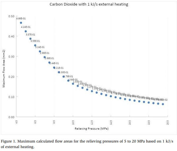 Example 1: Consider a carbon-dioxide refrigeration vessel that is 2 m long and 0.5 m in diameter, relieving at 12 MPa. Based on the heating basis equation contained within the IIAR CO2 Standard for Q = 28.39 kJ/s-m2 applied over the projected area (length x diameter)6 and the maximum flow area of 0.135 mm2 , which is shown in Figure 2 for relieving at 12 MPa, the required actual flow area is