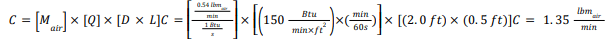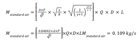 Example 3: Consider the system in the first example. To assist in specifying a relief valve, it is necessary to determine the required capacity for the mass flow rate of air at T = 293.15 K. We can use Fliegner’s formula8 for an ideal gas and assume a perfect nozzle, gas constant of R = 287.04 J/kg/K, and specific heat ratio for air of ϒ = 1.4. In addition, we must scale the result by applying the external heating Q = 28.39 kJ/s-m2 over the projected area, i.e., length (m) x diameter (m), which can be expressed as