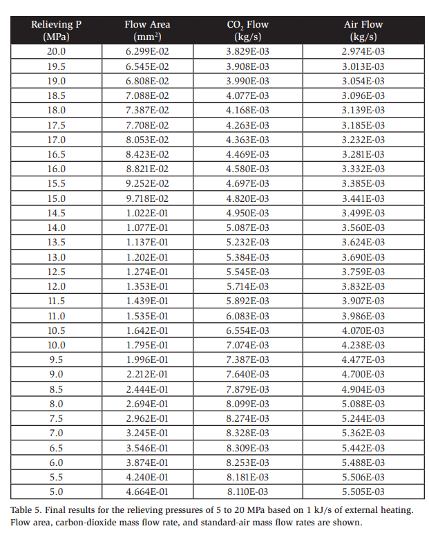 Table 5 shows the maximum flow area, mass flow rate of carbon dioxide, and mass flow rate of standard air evaluated on a unit external heating basis of 1 kJ/s for each relieving pressure. These values can help determine the discharge capacity in accordance with any of the safety standards, provided that their specific requirements are also considered.