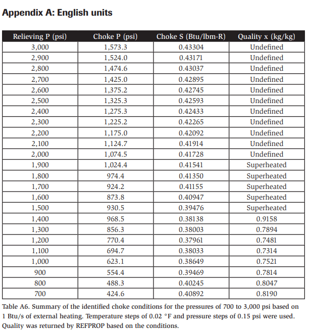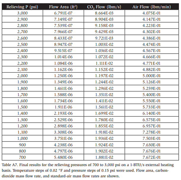 The key to implementing the method is the availability of carbon-dioxide state properties, which can be obtained from the NIST Reference Fluid Thermodynamic and Transport Properties Database (REFPROP). 4 The results are presented in a form that can be readily used by industry practitioners worldwide and potentially included in future editions of safety standards.