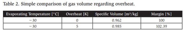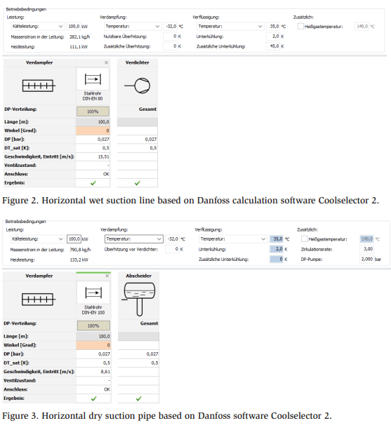 The simple comparison of pipe sizing uses a 100 m horizontal suction line. The line should not exceed a pressure loss of over 0.5 bar. Other values, such as cooling capacity and evaporation temperature, are the same. In conclusion, the size of the dry suction line is one size lower than that of the wet suction line. In addition to the pipe sizing, the insulation cost is less.
