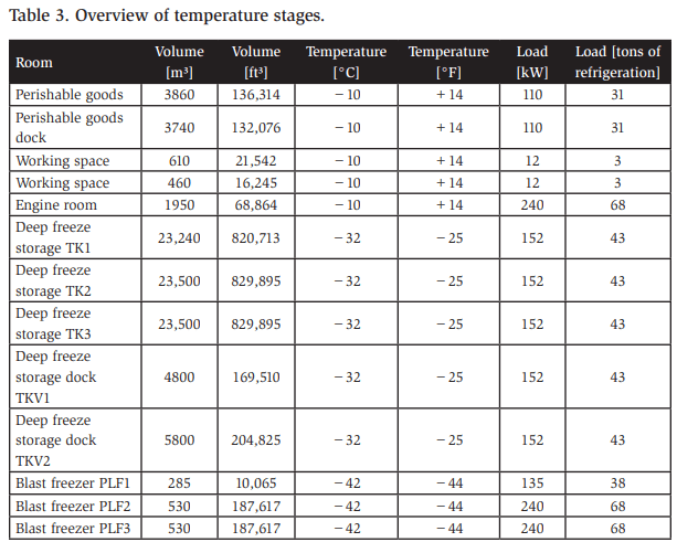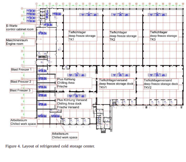 Figure 2 shows the layout of the facility. Generally, three temperature stages are present, as detailed in Table 2. The control cabinet room is the only room not operating by ammonia because of the risk of the reaction of copper and ammonia in case of leakage. The cold stores, cold store docks, chilled area, and chilled area docks are equipped with two ceiling-mounted air coolers. The engine room and switchboard cabinet room have one ceiling-mounted air cooler each. The chilled work areas each include one double-coil air cooler. In addition, one small blast freeze has one ceilingmounted air cooler. Two larger blast freezers employ two ceiling-mounted air coolers each.