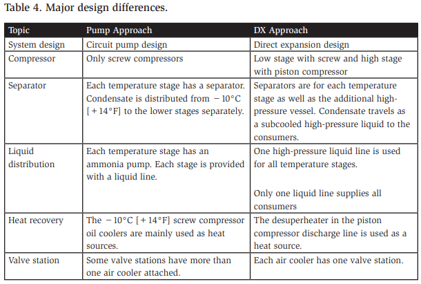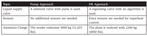 Table 3 lists the major design differences in the system designs. The DX system has the significant benefit of energy efficiency and operational cost savings. The drawback is the higher installation cost. Savings can be achieved with fewer and smaller pipes, smaller separators, and a piston instead of a screw compressor. However, costs rise with the number of valve stations, number of sensors, wiring and programming complexity, and larger and more expensive evaporators. In this case, the DX design is approximately 15% more expensive than the standard pump design.