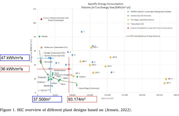 Comparing the performance of different plant designs is challenging. Various factors have significant impacts, including climate area, the type and turnover of the product, building type, the level of building insulation, and the education level of onsite employees. Each of these factors influences plant performance. For comparison, Jenson (2022) published a paper showing different plant designs in perspective. The author referenced the designs using the specific energy coefficient (SEC).
