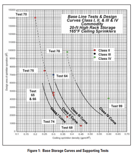 The modern storage fire protection requirements were developed by conducting a series of full-scale fi re tests in the late 1960’s and early 1970’s to develop standard water density base storage curves for 20 ft of storage under a 30 ft ceiling. The majority of these tests were performed for Class II commodity, with other commodities assumed to have curves parallel to the class II curve. Figure 1 demonstrates the base storage curves overlaid with the test points used to generate those curves.