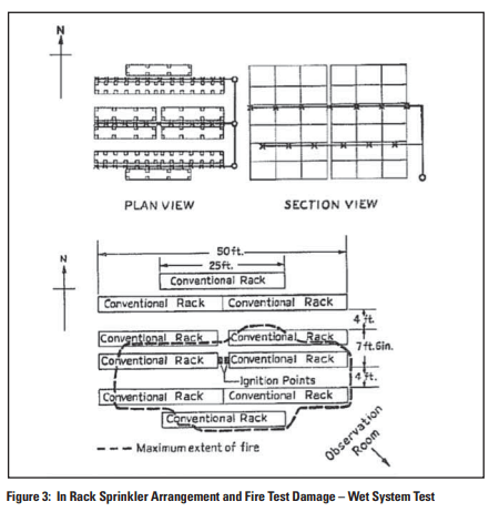 Figure 4 demonstrates the in-rack sprinkler layout and the extent of damage. Figure 4: 1981 FM Dry System Test – Fire Damage and In-Rack Sprinkler Layout