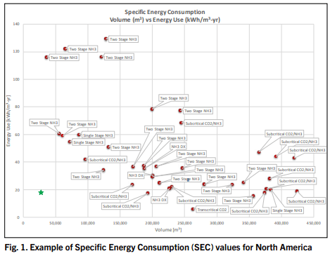 A common metric used for energy consumption in refrigerated warehouses is Specific Energy Consumption (SEC) in kWhn m-3n year-1 (kWhn ft-3n year-1) where volume refers to refrigerated volume.